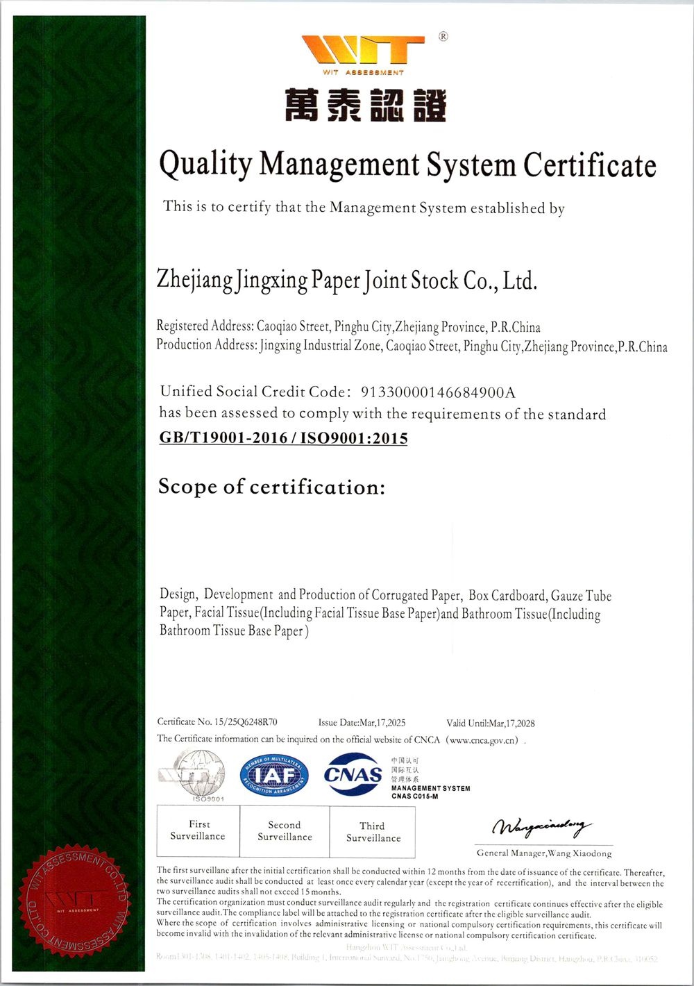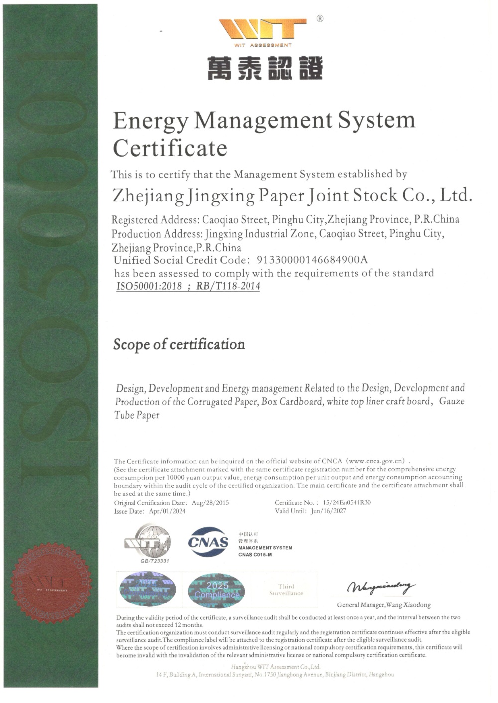 Jingxing Paper took the lead in the same industry to pass the ISO9001 quality management system and ISO14001 environmental management system certification, in 2014 passed the OHSAS18001 occupational health and safety management system certification, in 2015 passed GB / T23331 energy management system and FSC? forest system certification, passed in 2018 Certification of integration management of two industries.
