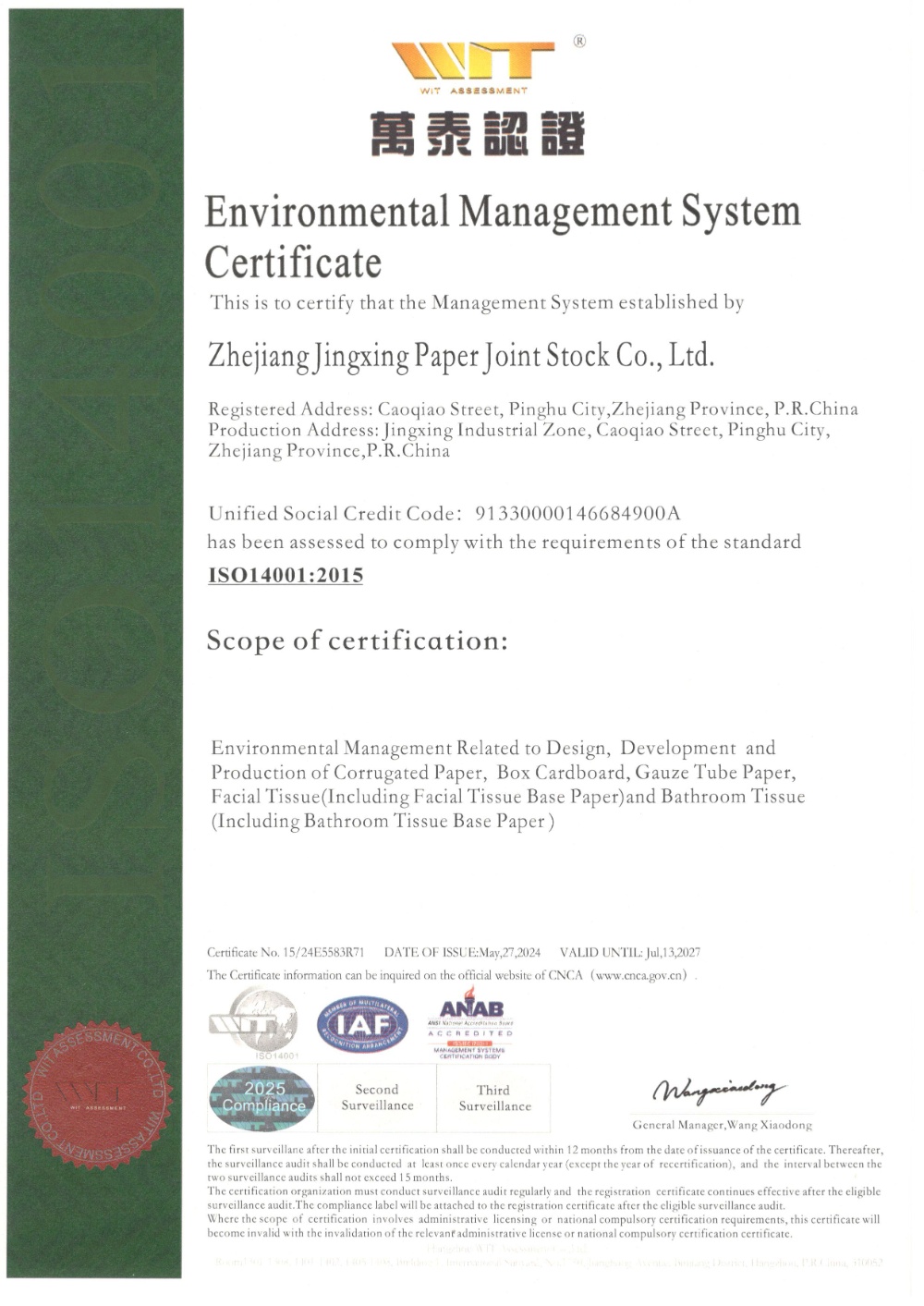 ISO14001環(huán)境管理體系認(rèn)證證書英文